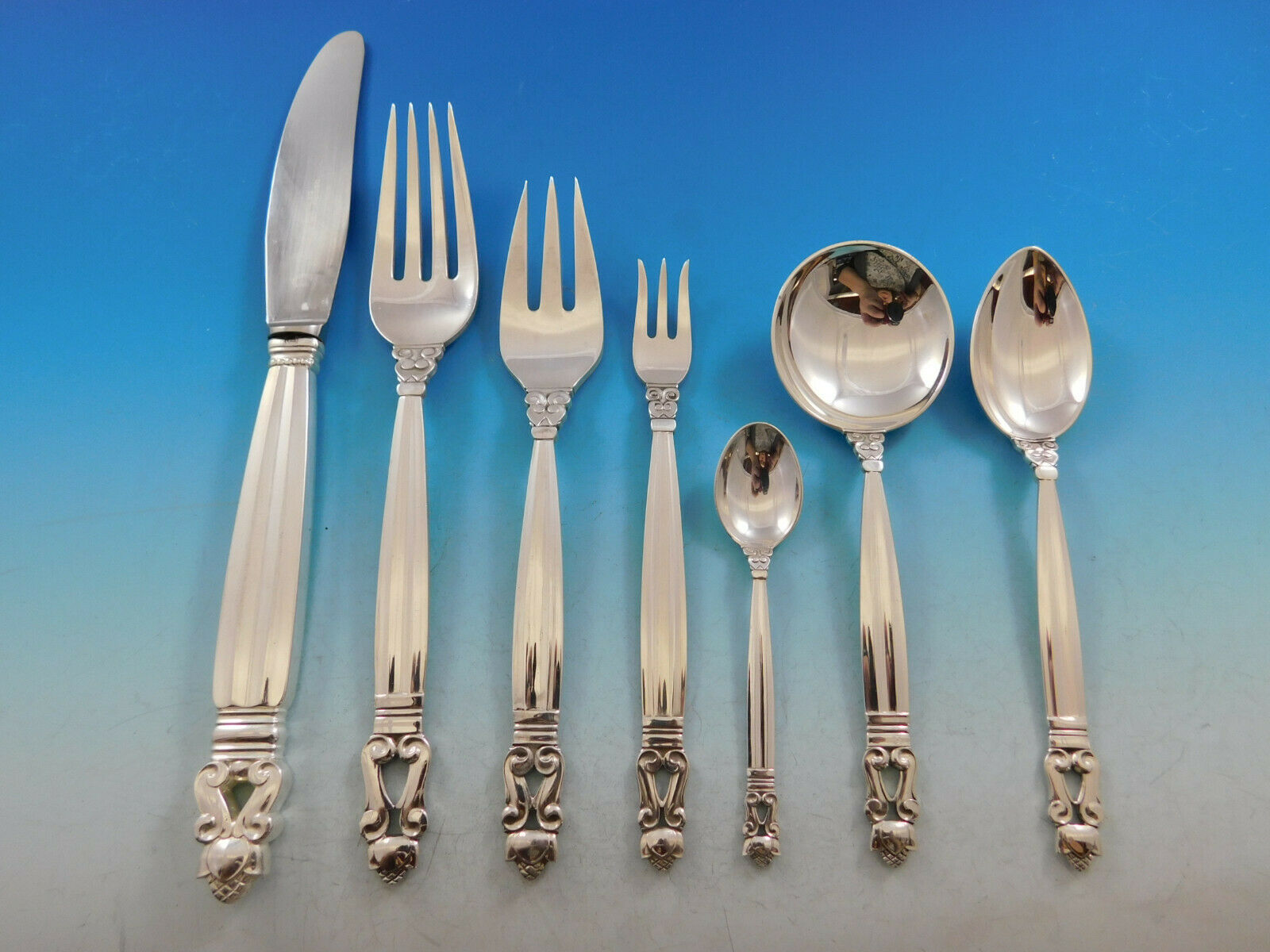 For over 100 years Georg Jensen has been a leader in Scandinavian design, crafting gorgeous, original products in an inimitable style. Gorgeous sterling silver stuns in this rich pattern that features a natural theme reminiscent of old world grace. A classic design yet with an understated touch, this pattern focuses on simple yet refined elegance. Dinner size Acorn by Georg Jensen sterlingsilver Flatware set – 89 pieces. This set includes